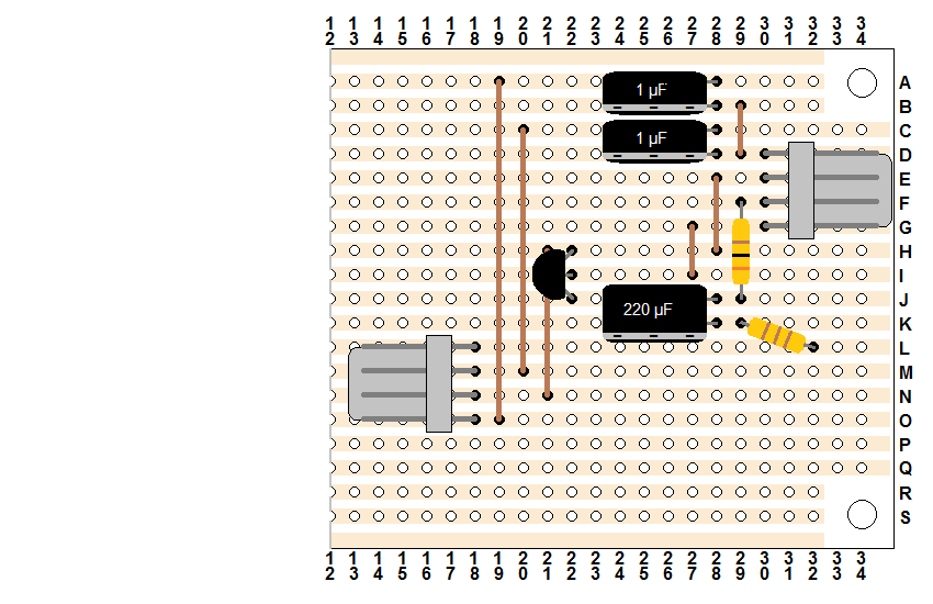 Next we need to build the 4 Pin Connector that will hook the RCA Jacks to the output side of the circuit we built. The connectors are quite small and lining them up to solder them is a little bit of a pain but the trickiest part here is to make absolutely sure your pins are in the correct order. To assist in this, here is a labeled version of the circuit board we built. Note that the output is on the lower left and the input is on the upper right. Also note that the input and output color order are the opposite of each other. If you mark each connector with a smudge of black where the ground pin is then each wire you connect to the board will only go on the correct connector where the black wire lines up with the black smudge. I also usually write “IN” and “OUT” on the board and the connectors with a marker just so it’s super clear.