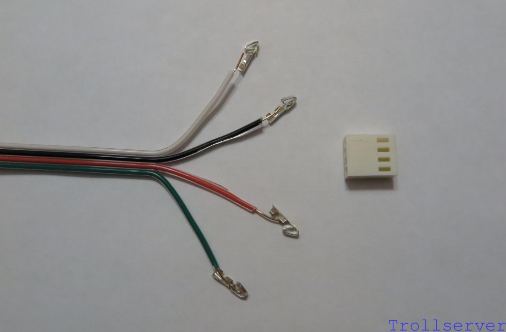 The output pins, from top to bottom are Green, Red, Black, then White. Because of all the fun gotchas listed above that means we actually need to start with our wire in the opposite direction. Layout the wire with the colors White, Black, Red, then Green from top to bottom as shown below. The connector pins shown in the picture below aren’t attached to anything yet.